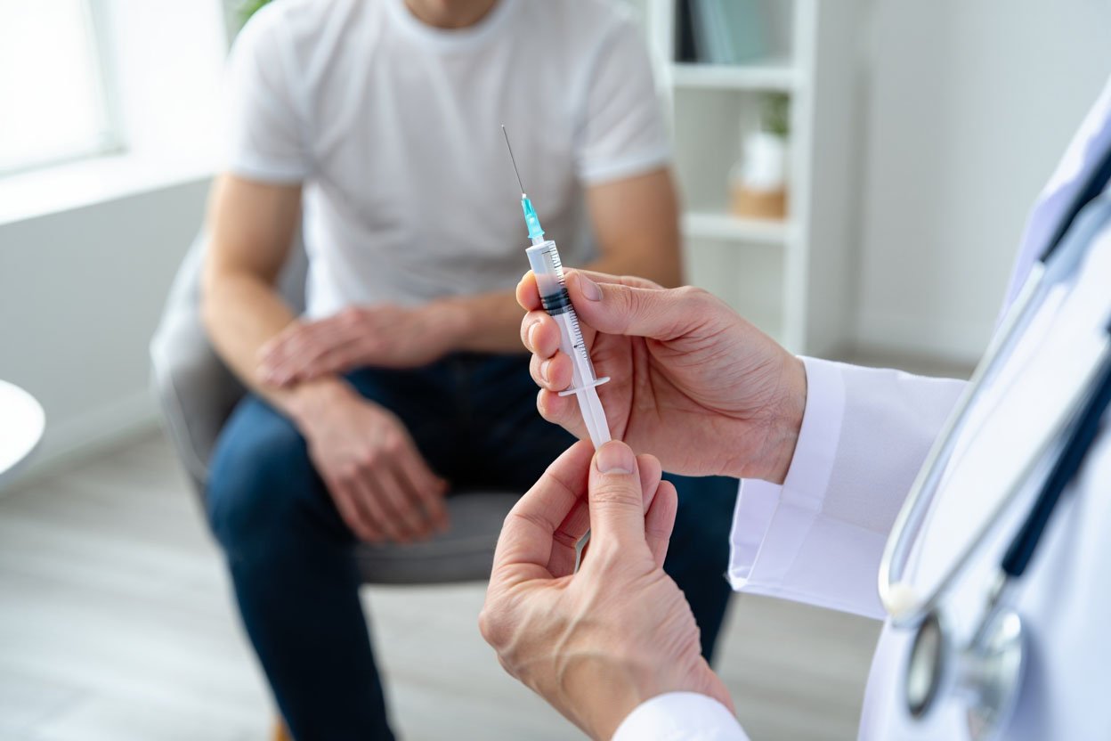 Врач держит в руке шприц